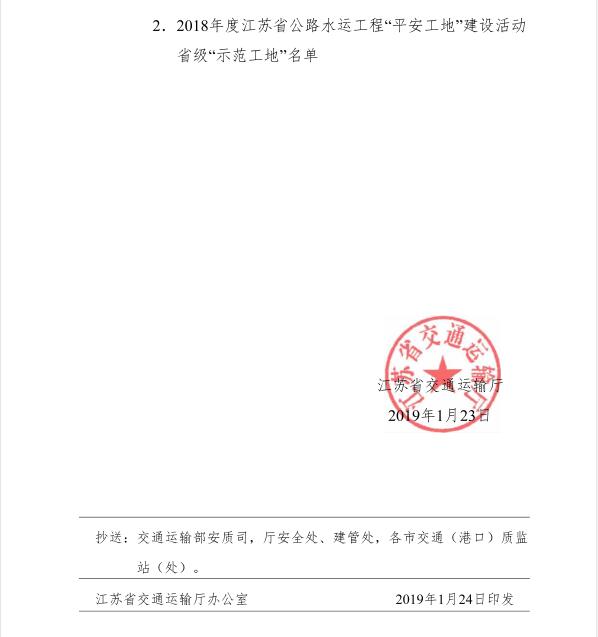 由中港建設集團有限公司施工的“南通港呂四港區10萬噸級進港航道(二階段)工程”被江蘇省交通運輸廳表彰為全省公路水運工程省級平安示范工地,體現了我公司牢固樹立紅線底線意識的自覺性,堅持科學發展、安全發展的前瞻性,深入開展平安工地建設的持續性。