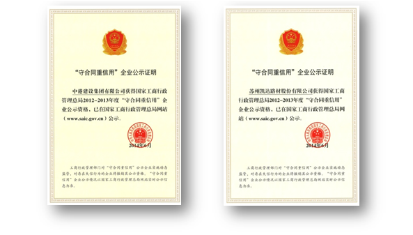 This is to certify that both Zhonggang Construction Group Co., Ltd. and its subsidiary Suzhou Kaida Road Materials Co., Ltd. were awarded the title of “Observing Contracts and Keeping Promises” in the year of 2012 to 2013 in June 2014 after national evaluation of all listed companies conducted by the State Administration for Industry and Commerce. Recently, Zhonggang Construction Group Co., Ltd. and its subsidiary Suzhou Kaida Road Materials Co., Ltd. have received the honor certificate of “Observing Contracts and Keeping Promises” issued by the State Administration for Industry and Commerce.